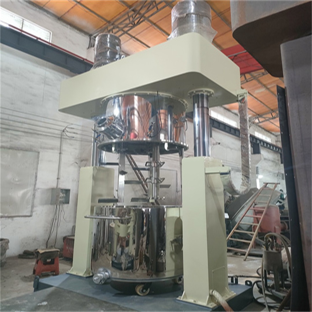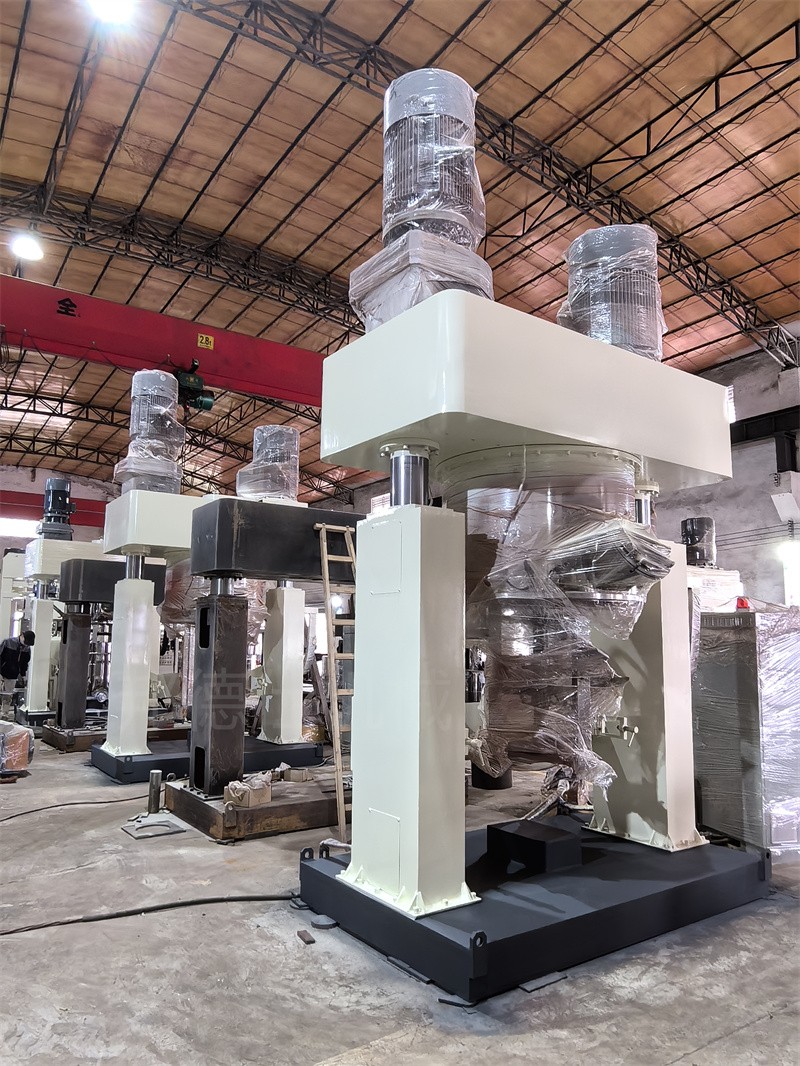 通過變頻器啟動行星架低速漿軸及高速分散軸,從低速調(diào)到高速進行攪拌,根據(jù)生產(chǎn)工藝,可從各管口加入各種材料,適時啟動真空泵進行真空下工作,停止工作時應從高速調(diào)到低速,最后停止轉(zhuǎn)動,打開真空閥放空才能升降橫梁,拉出料缸才能進行下一輪工作。